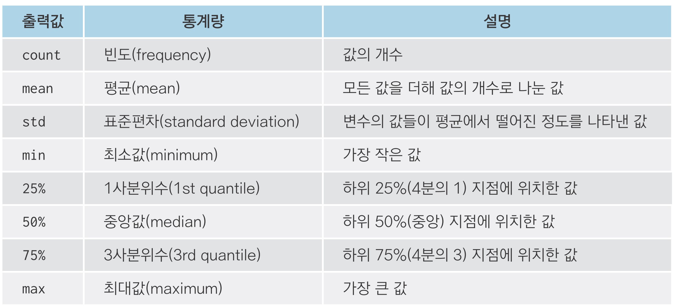 Non-Null Count: 결측치(누락된 값)를 제외하고 구한 값의 개수describe() - 요약 통계량 구하기 id nclass math english science