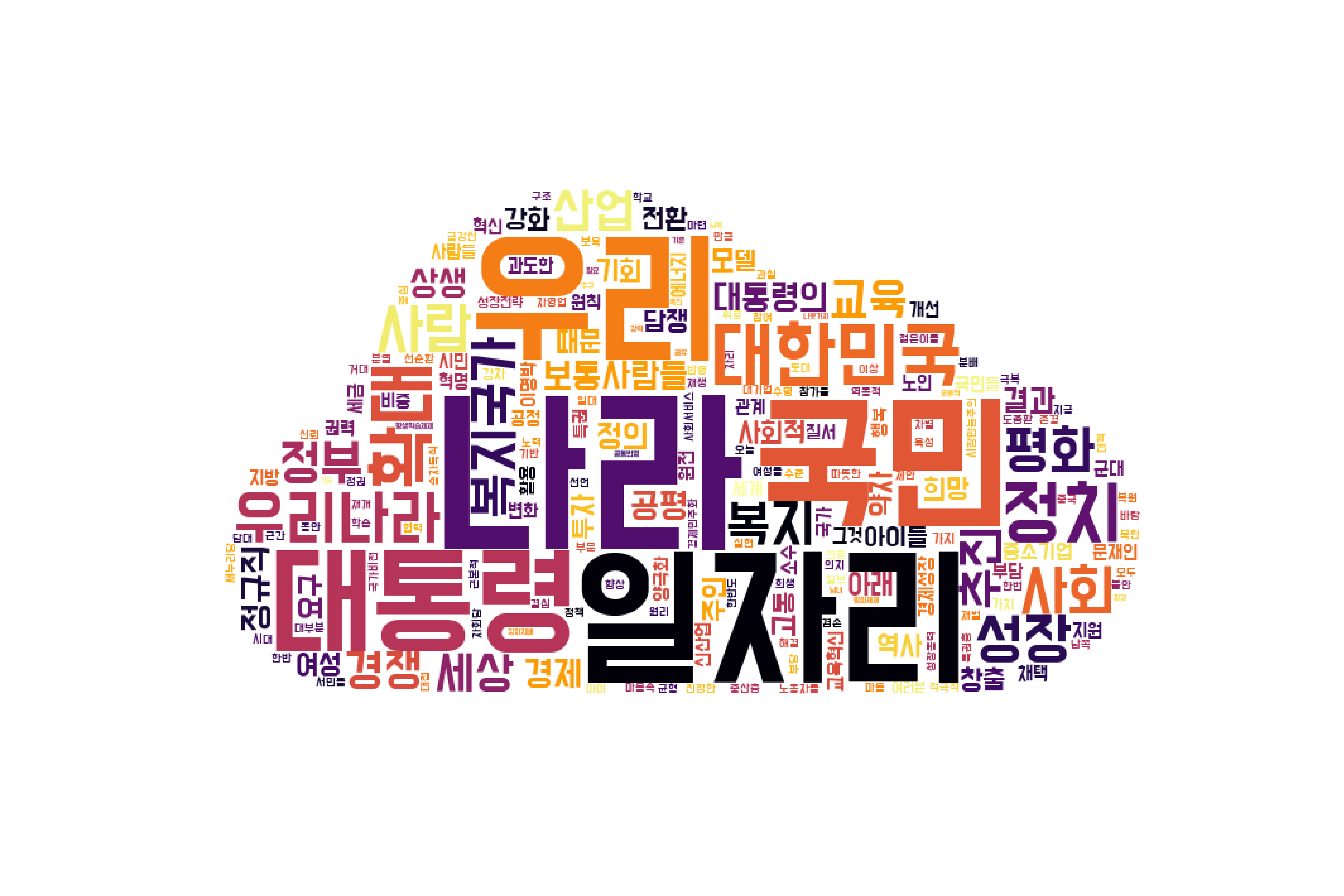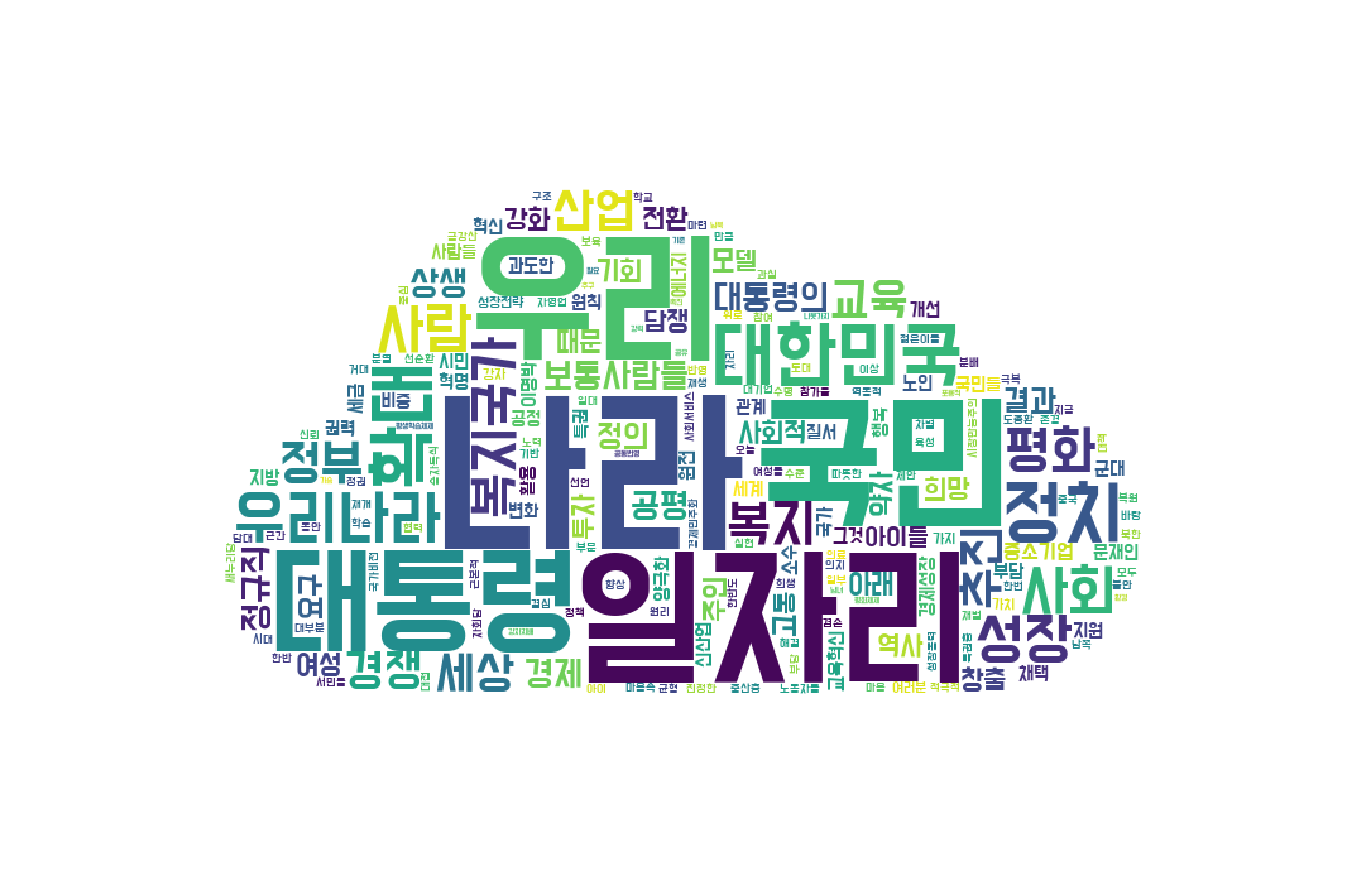 wordcloud 패키지 설치{'나라': 19, '일자리': 19, '국민': 18, '우리': 17, '대통령': 12, '대한민국': 11, '확대': 11, '정치': 10, '우리나라': 10, '사회': 9, '사람': 9, '성장': 9, '평화': 8, '복지국가': 8, '복지': 8, '산업': 7, '정부': 7, '추진': 7, '교육': 6, '세상': 6, '경쟁': 6, '보통사람들': 5, '공평': 5, '경제': 5, '대통령의': 5, '상생': 5, '정규직': 5, '정의': 4, '결과': 4, '사회적': 4, '투자': 4, '주인': 4, '전환': 4, '때문': 4, '모델': 4, '요구': 4, '희망': 4, '창출': 4, '역사': 4, '기회': 4, '여성': 4, '담쟁': 4, '강화': 4, '아래': 4, '고통': 4, '약자': 4, '아이들': 4, '중소기업': 4, '공정': 3, '문재인': 3, '특권': 3, '국가': 3, '사람들': 3, '노인': 3, '변화': 3, '비중': 3, '교육혁신': 3, '관계': 3, '질서': 3, '군대': 3, '지원': 3, '과도한': 3, '권력': 3, '부담': 3, '그것': 3, '지방': 3, '국민들': 3, '채택': 3, '소수': 3, '세계': 3, '신산업': 3, '시민': 3, '개선': 3, '혁신': 3, '혁명': 3, '양극화': 3, '원칙': 3, '활용': 3, '행복': 3, '원전': 3, '에너지': 3, '경제성장': 3, '세금': 3, '이명박': 3, '성장전략': 3, '가치': 3, '가지': 3, '여러분': 3, '강자': 3, '진정한': 2, '노동자들': 2, '마음속': 2, '노력': 2, '만큼': 2, '육성': 2, '모두': 2, '의료': 2, '참여': 2, '지금': 2, '의지': 2, '중심': 2, '역동적': 2, '마련': 2, '마음': 2, '대기업': 2, '위로': 2, '따뜻한': 2, '도종환': 2, '참가율': 2, '여성들': 2, '차별': 2, '담대': 2, '아이': 2, '원리': 2, '대책': 2, '대접': 2, '대부분': 2, '재생': 2, '바탕': 2, '중산층': 2, '실현': 2, '자영업': 2, '북한': 2, '분배': 2, '분열': 2, '정권': 2, '젊은이들': 2, '불안': 2, '남쪽': 2, '성장동력': 2, '자회담': 2, '선언': 2, '적극적': 2, '선순환': 2, '사회서비스': 2, '서민들': 2, '재개': 2, '재벌': 2, '자리': 2, '부문': 2, '부당': 2, '시대': 2, '이상': 2, '중국': 2, '새누리당': 2, '신뢰': 2, '시장만능주의': 2, '반영': 2, '존경': 2, '제안': 2, '정책': 2, '승자독식': 2, '보육': 2, '일대': 2, '복원': 2, '일부': 2, '수준': 2, '수명': 2, '희생': 2, '동안': 2, '오늘': 2, '기반': 2, '금강산': 2, '근본적': 2, '거대': 2, '협력': 2, '근간': 2, '극복': 2, '균형': 2, '결심': 2, '토대': 2, '겸손': 2, '향상': 2, '국가비전': 2, '특권층': 2, '경제민주화': 2, '구조': 2, '해결': 2, '한번': 2, '한반도': 2, '한반': 2, '학습': 2, '과실': 2, '학교': 2, '평생학습체제': 2, '공유': 2, '필요': 2, '평화체제': 2, '포용적': 2, '추구': 2, '공동번영': 2, '남녀': 2, '남북': 2, '가슴': 2, '강력': 2, '강자지배': 2, '기존': 2, '나뭇가지': 2, '촉진': 2, '환경': 2, '기업': 2, '유효수요': 1, '자율성': 1, '운명': 1, '자체': 1, '한반도평화': 1, '잠자리': 1, '우위': 1, '휴전선': 1, '훗날': 1, '자영업자들': 1, '자원': 1, '잠재력': 1, '한숨': 1, '한편': 1, '후분배': 1, '해방': 1, '자신': 1, '자식': 1, '자본주': 1, '자본': 1, '학생들': 1, '장기요양보험': 1, '잠재적': 1, '재촉': 1, '적용': 1, '적극': 1, '요양': 1, '포퓰리즘': 1, '표정': 1, '저하': 1, '풍요': 1, '용인': 1, '저것': 1, '재편': 1, '하나': 1, '학생': 1, '재정지출': 1, '재생에너지': 1, '하늘': 1, '흡수': 1, '재분배': 1, '재벌집단': 1, '학교폭력': 1, '학부모': 1, '자녀들': 1, '잣대': 1, '효도': 1, '입시부담': 1, '해소': 1, '이득': 1, '이익': 1, '이유': 1, '이외': 1, '협동조합': 1, '위정자': 1, '이불': 1, '협력적': 1, '협상': 1, '형성': 1, '유능': 1, '이념': 1, '협동': 1, '호혜협력': 1, '의무': 1, '유럽': 1, '확고': 1, '의견': 1, '유산': 1, '유아': 1, '육아': 1, '확립': 1, '확산': 1, '협동생태계': 1, '월세': 1, '입장': 1, '활성화': 1, '확장': 1, '효과': 1, '입시': 1, '일할': 1, '일자리점검': 1, '행세': 1, '획기적': 1, '황금': 1, '헌법상': 1, '일본': 1, '헌신': 1, '이행': 1, '인터넷': 1, '전기자동차': 1, '인정': 1, '인식': 1, '현실': 1, '인력': 1, '인도': 1, '인간답': 1, '인간': 1, '현장': 1, '혁신도시': 1, '철학': 1, '포기': 1, '출발': 1, '진단': 1, '직속': 1, '출마선언': 1, '지역우대': 1, '지역사회': 1, '출마선언문': 1, '지역균형발전': 1, '지역경제': 1, '외면': 1, '지속가능성': 1, '지속가능': 1, '지배구조': 1, '지배': 1, '탁월': 1, '지방채용': 1, '지방대학': 1, '출발선': 1, '출산율': 1, '취약': 1, '취업': 1, '취업불안': 1, '측근세력들': 1, '지구상': 1, '중지': 1, '중요': 1, '침해': 1, '출마': 1, '진보': 1, '진보세력만': 1, '진심어린': 1, '천지': 1, '첫째': 1, '척결': 1, '채용': 1, '창조적': 1, '창조성': 1, '청산': 1, '청산해': 1, '창의성': 1, '창고': 1, '참여정부': 1, '초등단계': 1, '초라한': 1, '차원': 1, '차별철폐': 1, '집중': 1, '집안': 1, '집단협업': 1, '최상위': 1, '집단': 1, '진출': 1, '최우선': 1, '최저': 1, '최저임금': 1, '진정성': 1, '콘텐츠산업': 1, '중상모략': 1, '전반': 1, '평생학습': 1, '패자부활': 1, '편가르지': 1, '정조대왕': 1, '평가': 1, '정의로운': 1, '평등': 1, '정부구조': 1, '평범': 1, '정보통신': 1, '평생': 1, '정도': 1, '정당한': 1, '평창': 1, '토건사업': 1, '정권교체': 1, '점검': 1, '평화경제': 1, '절실': 1, '절박한': 1, '철저': 1, '평화로운': 1, '평화적': 1, '전진': 1, '전쟁': 1, '전장': 1, '전세계': 1, '패자': 1, '패배주의': 1, '파탄': 1, '정책과정': 1, '중단': 1, '토건세력': 1, '주요': 1, '주변국들': 1, '주도적': 1, '주거불안': 1, '주거복지': 1, '종사': 1, '종말': 1, '종류': 1, 