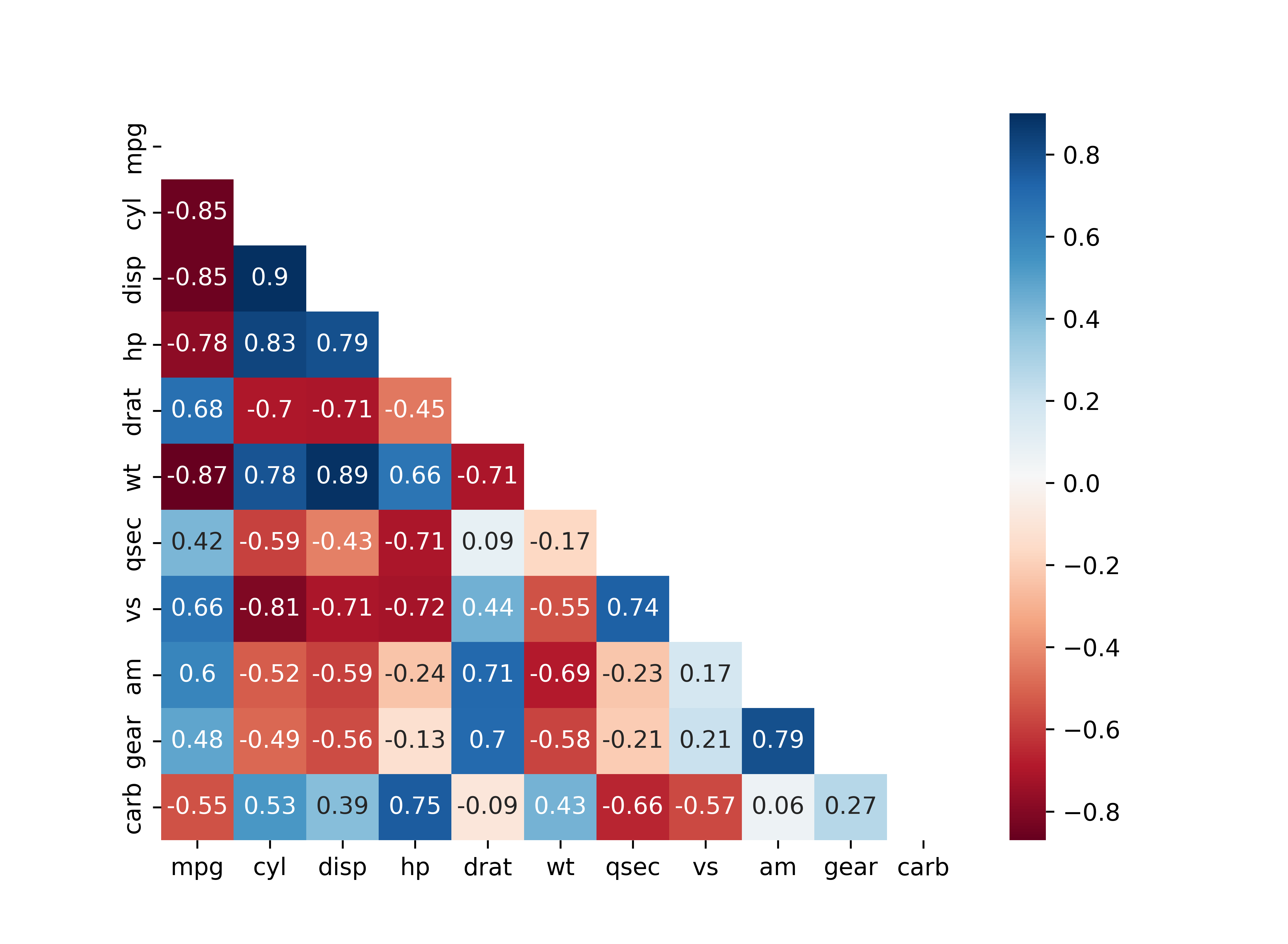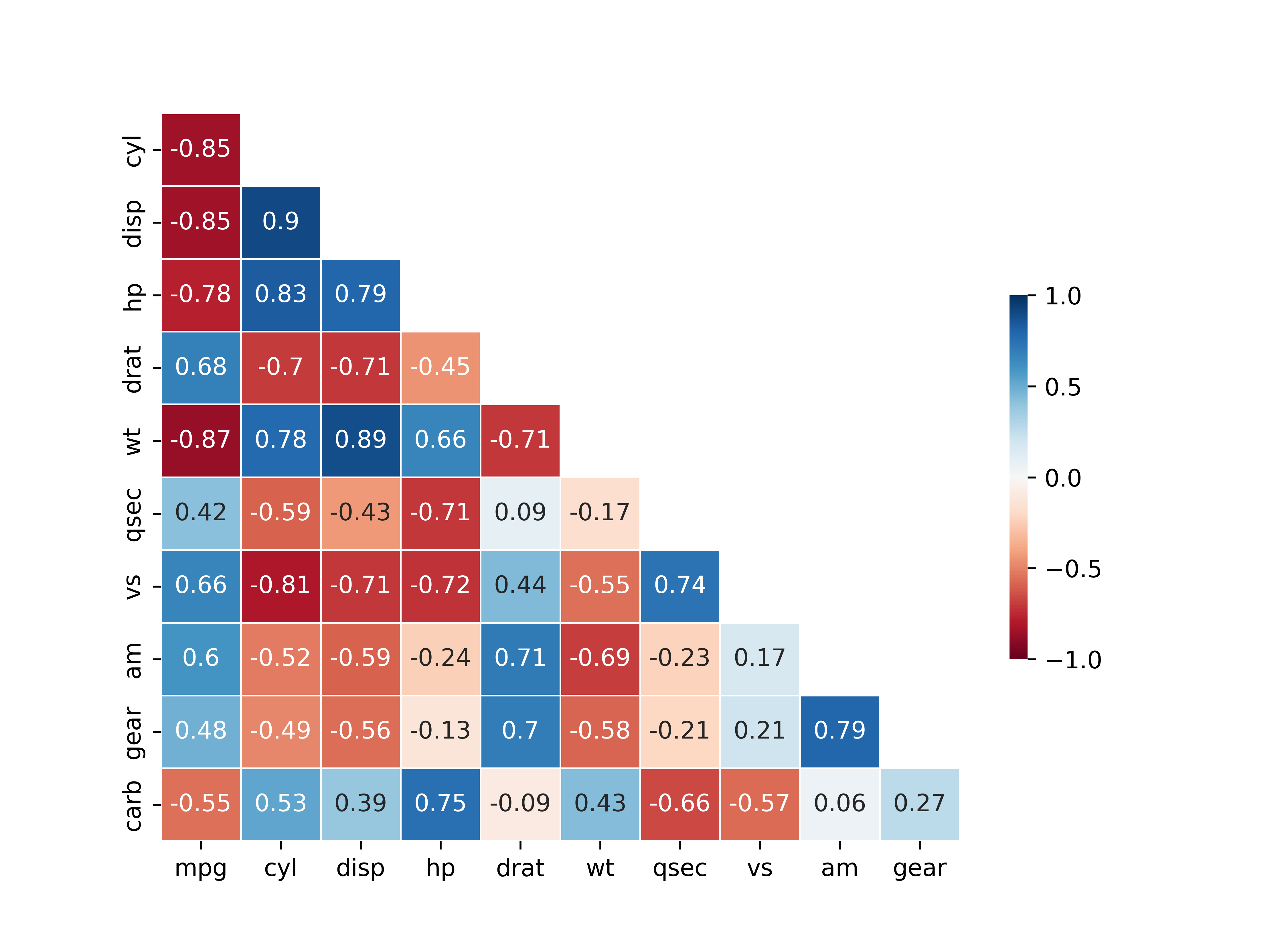 mpg행, 오른쪽 아래 carb열에 아무 값도 표현되어 있지 않음mask와 상관행렬의 첫 번째 행과 마지막 열을 제거해서 빈 행과 열 제거