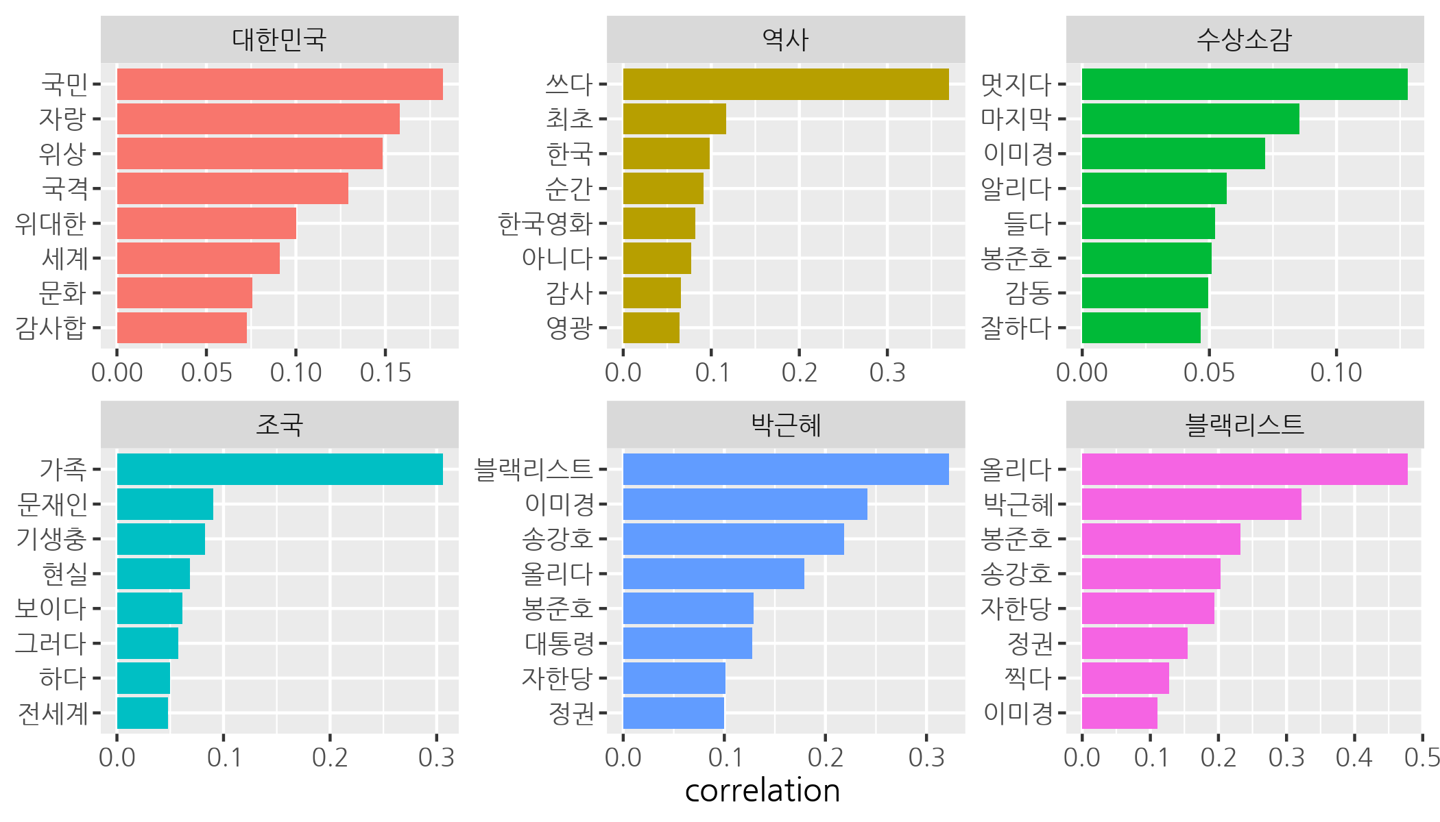 ## # A tibble: 26,732 x 3##    item1      item2      correlation##    <chr>      <chr>            <dbl>##  1 올리다     블랙리스트       0.478##  2 블랙리스트 올리다           0.478##  3 역사       쓰다             0.370##  4 쓰다       역사             0.370##  5 박근혜     블랙리스트       0.322##  6 블랙리스트 박근혜           0.322##  7 가족       조국             0.306##  8 조국       가족             0.306##  9 작품상     감독상           0.276## 10 감독상     작품상           0.276## # … with 26,722 more rowsword_cors %>%  filter(item1 == "대한민국")## # A tibble: 163 x 3##    item1    item2  correlation##    <chr>    <chr>        <dbl>##  1 대한민국 국민        0.182 ##  2 대한민국 자랑        0.158 ##  3 대한민국 위상        0.149 ##  4 대한민국 국격        0.129 ##  5 대한민국 위대한      0.100 ##  6 대한민국 세계        0.0910##  7 대한민국 문화        0.0757##  8 대한민국 감사합      0.0724##  9 대한민국 나라        0.0715## 10 대한민국 오늘        0.0715## # … with 153 more rowsword_cors %>%  filter(item1 == "역사")## # A tibble: 163 x 3##    item1 item2    correlation##    <chr> <chr>          <dbl>##  1 역사  쓰다          0.370 ##  2 역사  최초          0.117 ##  3 역사  한국          0.0982##  4 역사  순간          0.0910##  5 역사  한국영화      0.0821##  6 역사  아니다        0.0774##  7 역사  감사          0.0654##  8 역사  영광          0.0640##  9 역사  영화제        0.0596## 10 역사  오스카        0.0593## # … with 153 more rows# 관심 단어 목록 생성target <- c("대한민국", "역사", "수상소감", "조국", "박근혜", "블랙리스트")top_cors <- word_cors %>%  filter(item1 %in% target) %>%  group_by(item1) %>%  slice_max(correlation, n = 8)# 그래프 순서 정하기top_cors$item1 <- factor(top_cors$item1, levels = target)library(ggplot2)ggplot(top_cors, aes(x = reorder_within(item2, correlation, item1),                 y = correlation,                 fill = item1)) +  geom_col(show.legend = F) +  facet_wrap(~ item1, scales = "free") +  coord_flip() +  scale_x_reordered() +  labs(x = NULL) +  theme(text = element_text(family = "nanumgothic"))