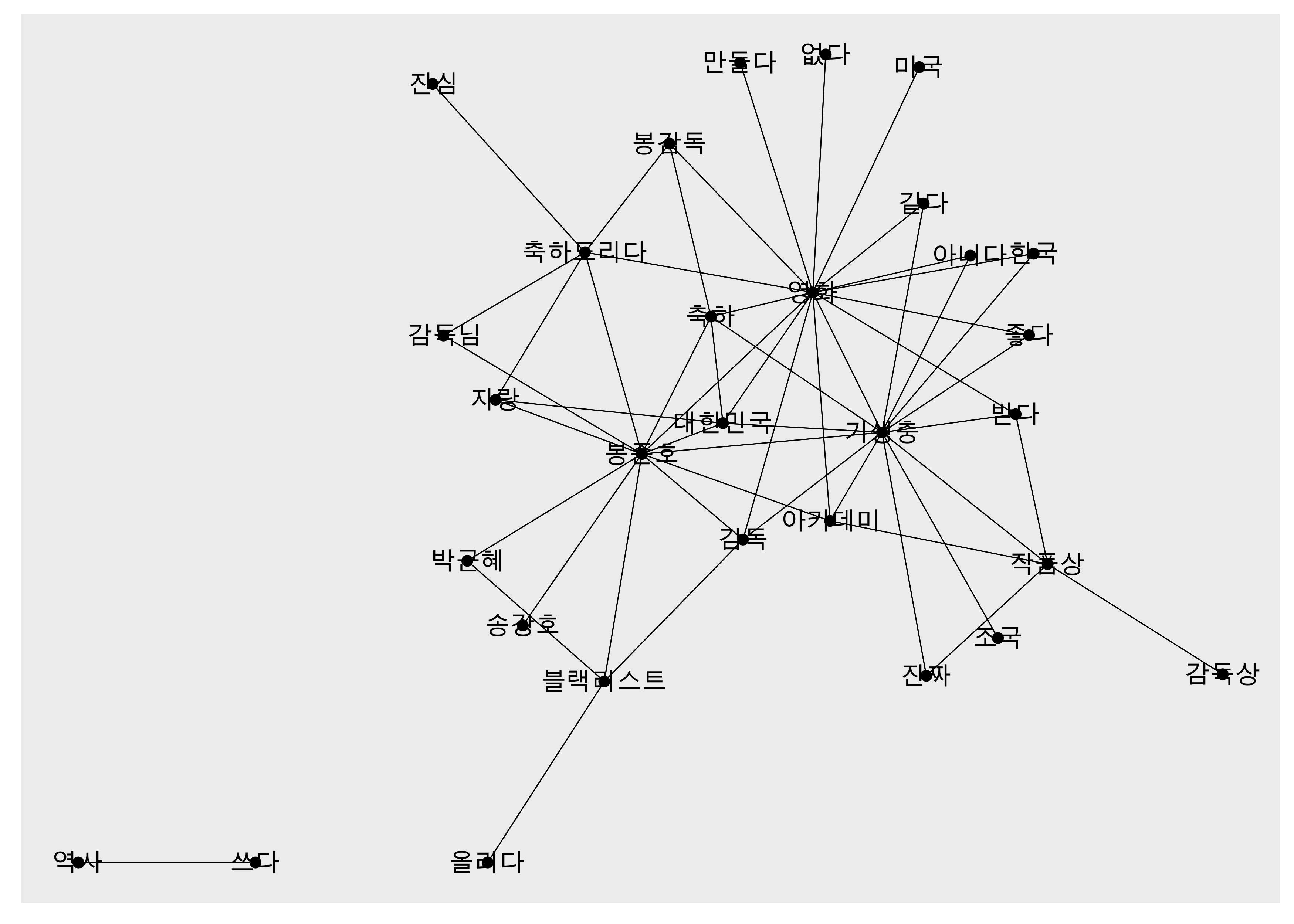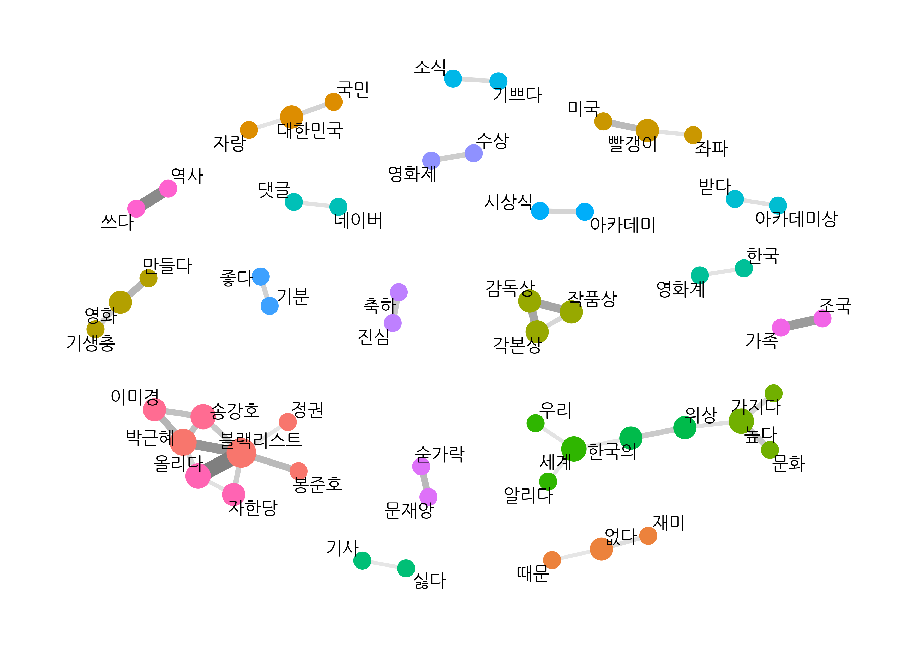 # 동시 출현 단어쌍pair %>%  filter(item1 == "대한민국")## # A tibble: 1,010 x 3##    item1    item2        n##    <chr>    <chr>    <dbl>##  1 대한민국 봉준호      70##  2 대한민국 축하        54##  3 대한민국 자랑        44##  4 대한민국 영화        30##  5 대한민국 기생충      27##  6 대한민국 국민        22##  7 대한민국 세계        16##  8 대한민국 아카데미    16##  9 대한민국 위상        15## 10 대한민국 좋다        14## # … with 1,000 more rows# 바이그램 단어쌍pair_bigram %>%  filter(word1 == "대한민국")## # A tibble: 109 x 3##    word1    word2      n##    <chr>    <chr>  <int>##  1 대한민국 국민      21##  2 대한민국 자랑      15##  3 대한민국 영화      11##  4 대한민국 국격       8##  5 대한민국 위상       7##  6 대한민국 만세       6##  7 대한민국 봉준호     5##  8 대한민국 문화       4##  9 대한민국 영광       4## 10 대한민국 기생충     3## # … with 99 more rows# 네트워크 그래프 데이터 만들기graph_bigram <- pair_bigram %>%  filter(n >= 8) %>%  as_tbl_graph()# 네트워크 그래프 만들기set.seed(1234)word_network(graph_bigram)