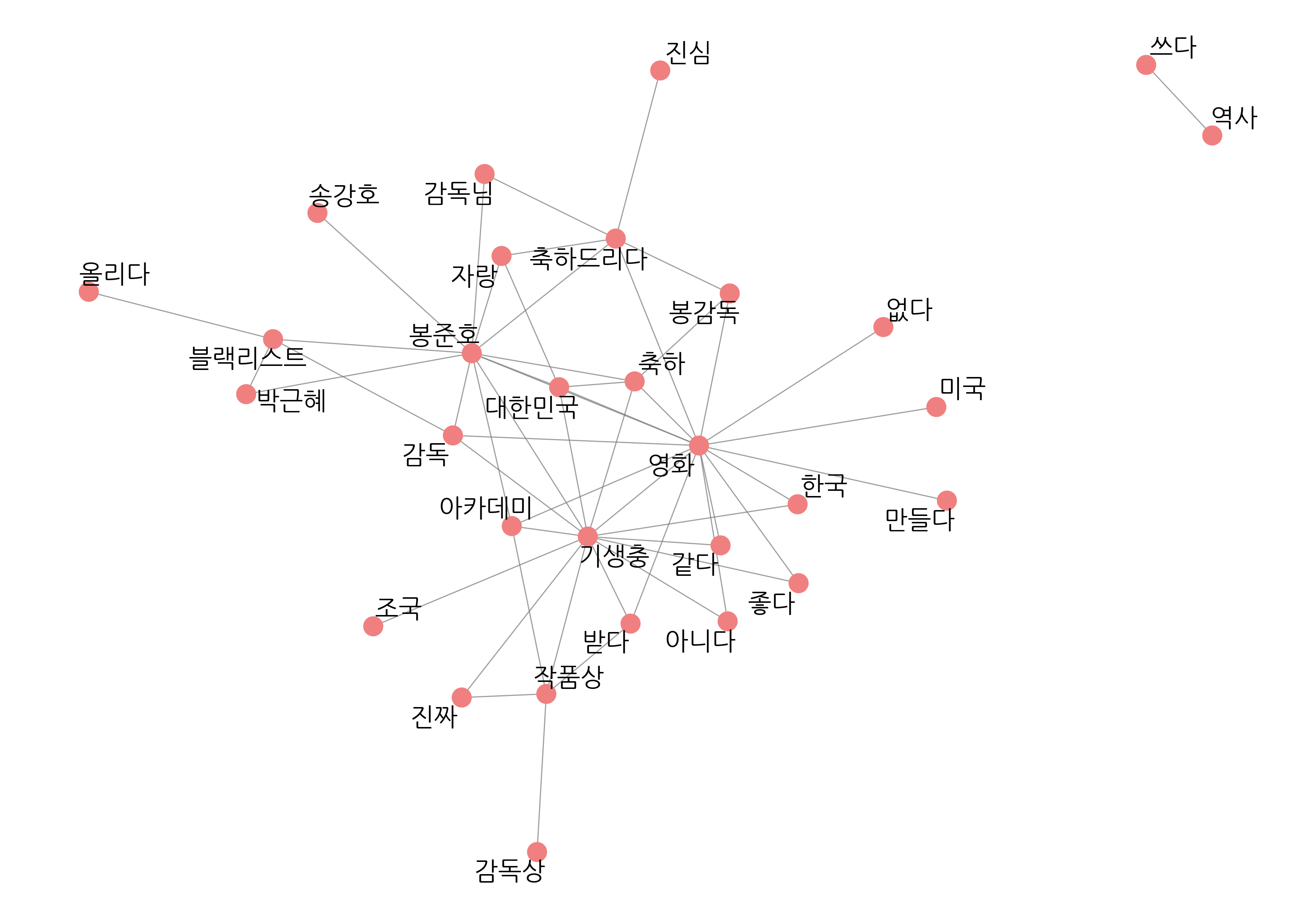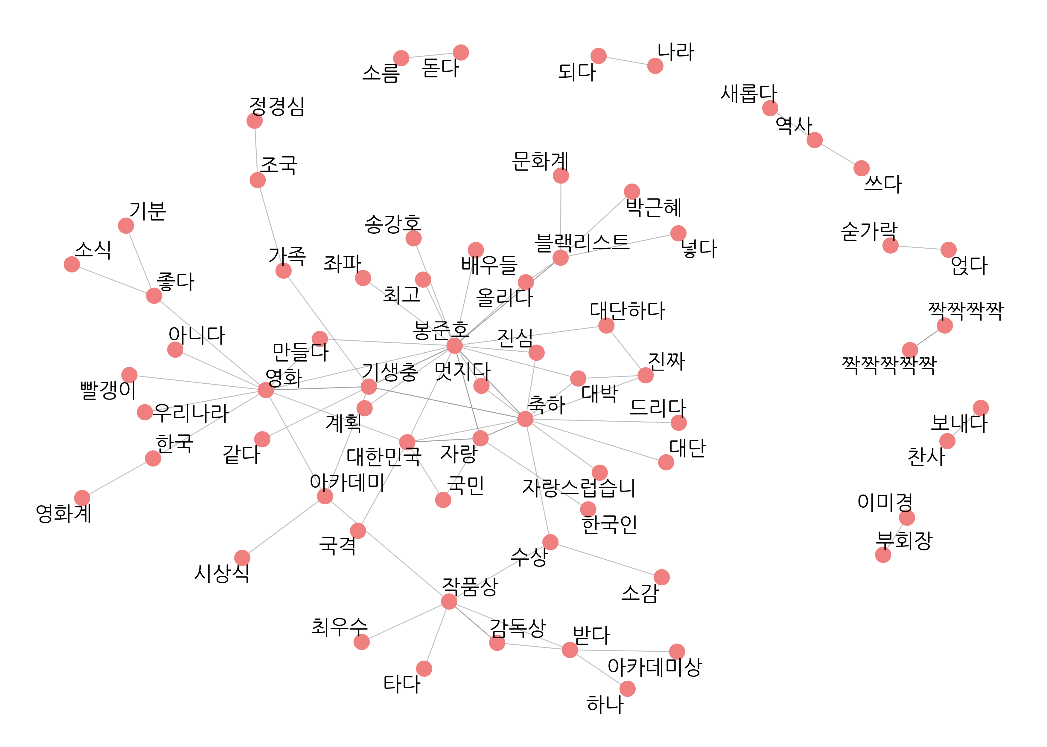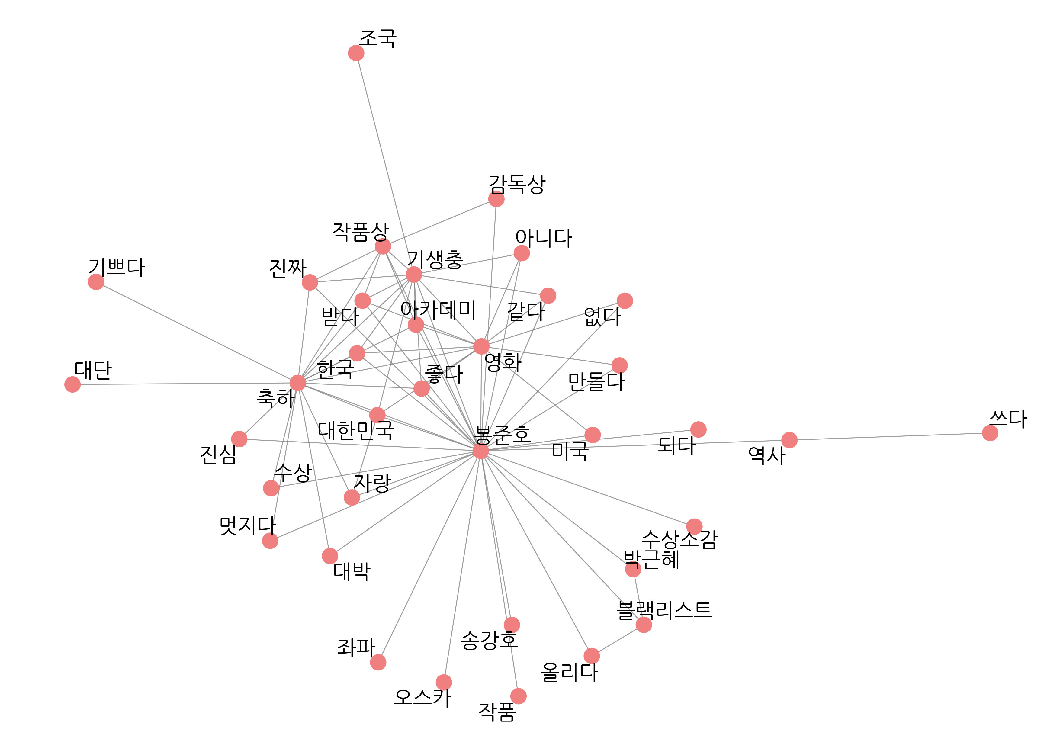 word_network <- function(x) {  ggraph(x, layout = "fr") +    geom_edge_link(color = "gray50",                   alpha = 0.5) +    geom_node_point(color = "lightcoral",                    size = 5) +    geom_node_text(aes(label = name),                   repel = T,                   size = 5,                   family = "nanumgothic") +    theme_graph()}set.seed(1234)word_network(graph_comment)"감독", "봉감독", "봉준호감독"# 유의어 처리하기comment <- comment %>%  mutate(word = ifelse(str_detect(word, "감독") &                      !str_detect(word, "감독상"), "봉준호", word),         word = ifelse(word == "오르다", "올리다", word),         word = ifelse(str_detect(word, "축하"), "축하", word))# 단어 동시 출현 빈도 구하기pair <- comment %>%  pairwise_count(item = word,                 feature = id,                 sort = T)# 네트워크 그래프 데이터 만들기graph_comment <- pair %>%  filter(n >= 25) %>%  as_tbl_graph()# 네트워크 그래프 만들기set.seed(1234)word_network(graph_comment)