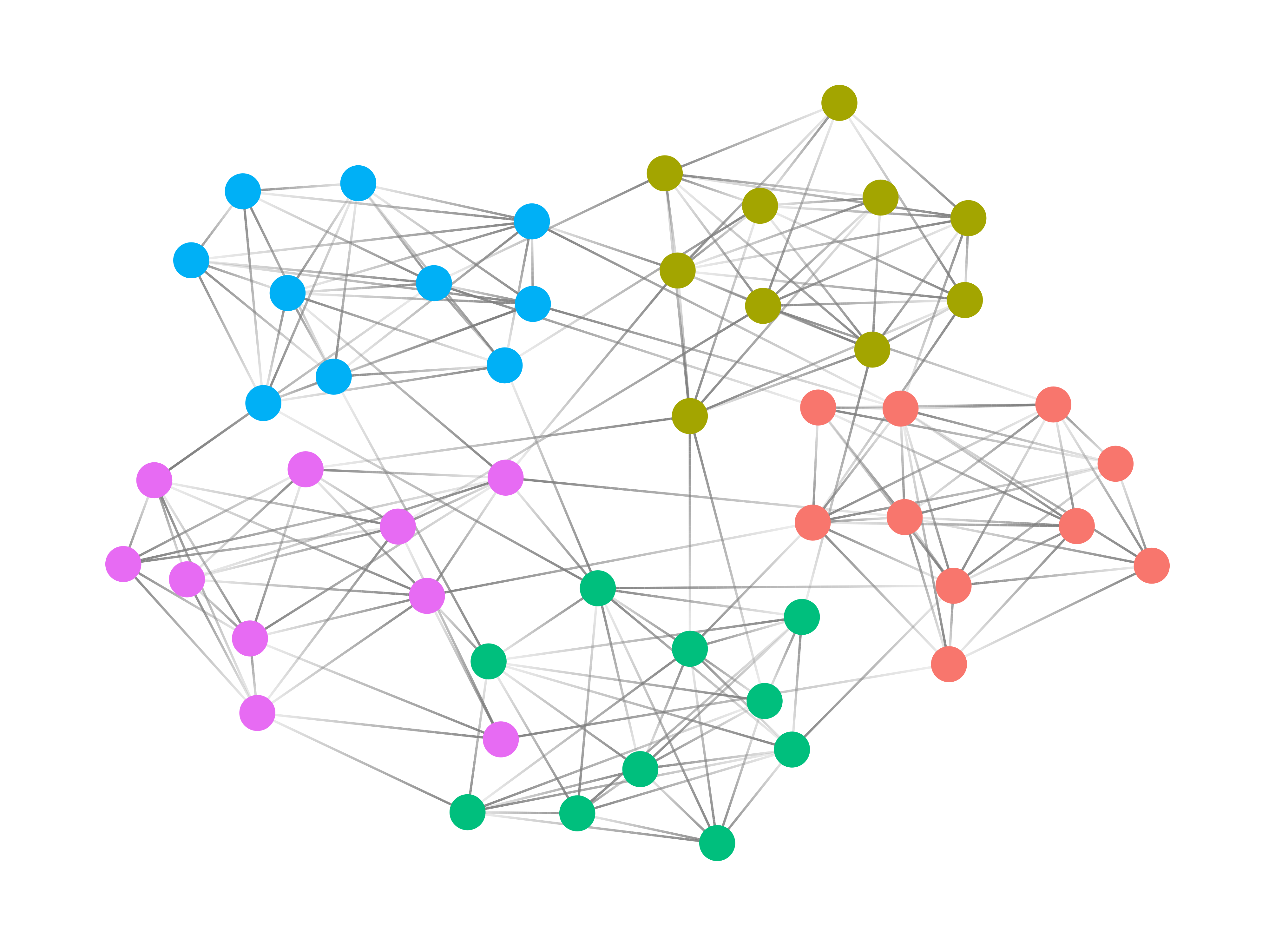 set.seed(1234)graph_cors <- word_cors %>%  filter(correlation >= 0.15) %>%  as_tbl_graph(directed = F) %>%  mutate(centrality = centrality_degree(),         group = as.factor(group_infomap()))set.seed(1234)ggraph(graph_cors, layout = "fr") +  geom_edge_link(color = "gray50",                 aes(edge_alpha = correlation,   # 엣지 명암                     edge_width = correlation),  # 엣지 두께                 show.legend = F) +              # 범례 삭제  scale_edge_width(range = c(1, 4)) +            # 엣지 두께 범위  geom_node_point(aes(size = centrality,                      color = group),                  show.legend = F) +  scale_size(range = c(5, 10)) +  geom_node_text(aes(label = name),                 repel = T,                 size = 5,                 family = "nanumgothic") +  theme_graph()
