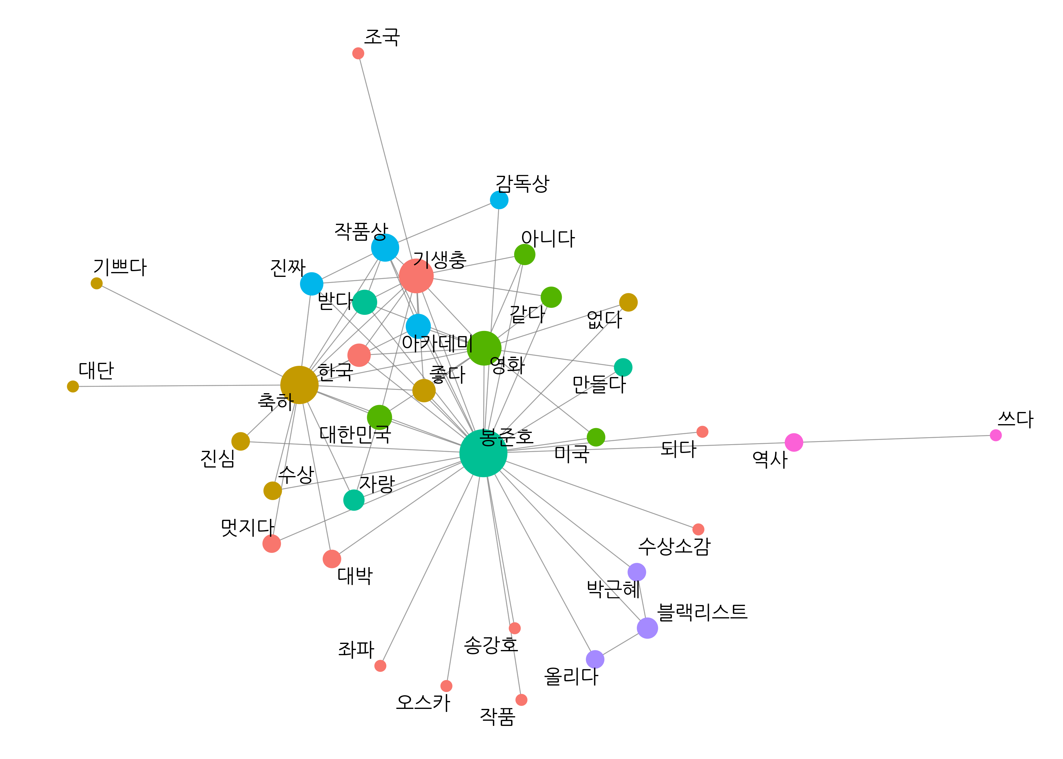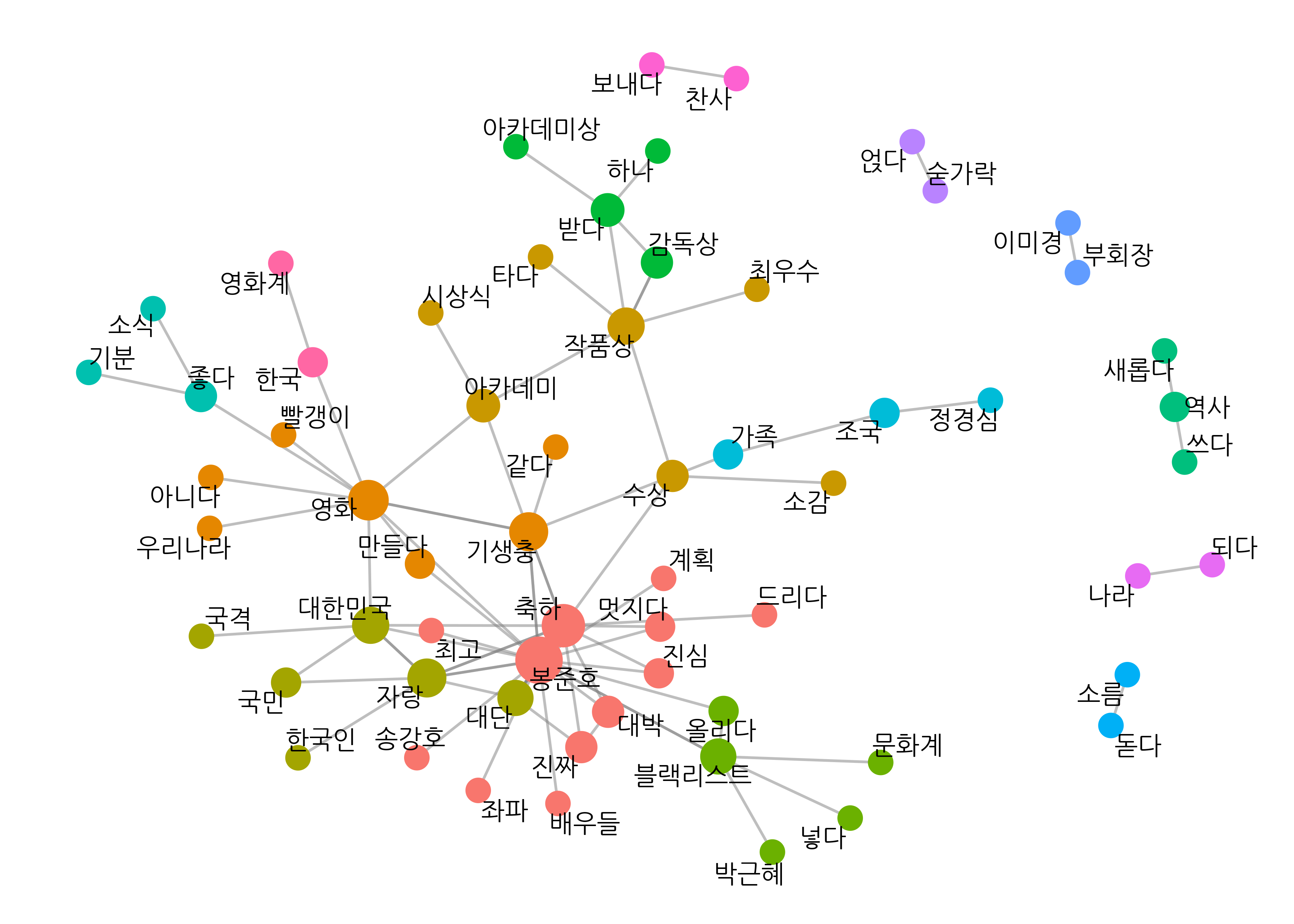 as_tbl_graph()directed = F: 방향성 없도록 설정group_infomap()은 방향성 없는 네트워크 그래프 데이터에서만 커뮤니티를 찾아줌as_tbl_graph()directed = F: 방향성 없도록 설정group_infomap()은 방향성 없는 네트워크 그래프 데이터에서만 커뮤니티를 찾아줌centrality_degree()group_infomap()as.factor(): factor 타입으로 변환해 노드 그룹별로 다른 색으로 표현set.seed(1234)graph_comment <- pair %>%  filter(n >= 25) %>%  as_tbl_graph(directed = F) %>%  mutate(centrality = centrality_degree(),    # 연결 중심성         group = as.factor(group_infomap()))  # 커뮤니티graph_comment## # A tbl_graph: 36 nodes and 152 edges## ### # An undirected multigraph with 1 component## ### # Node Data: 36 x 3 (active)##   name       centrality group##   <chr>           <dbl> <fct>## 1 봉준호             62 4    ## 2 축하               34 2    ## 3 영화               26 3    ## 4 블랙리스트          6 6    ## 5 기생충             26 1    ## 6 대한민국           10 3    ## # … with 30 more rows## ### # Edge Data: 152 x 3##    from    to     n##   <int> <int> <dbl>## 1     1     2   198## 2     1     2   198## 3     1     3   119## # … with 149 more rowsgeom_node_point(aes())size = centrality: 연결 중심성에 따라 노드 크기 설정color = group: 커뮤니티 별로 노드 색깔 다르게geom_node_point(show.legend = F): 범례 제거scale_size(range = c(5, 15)): 노드 크기 5~15 범위 유지set.seed(1234)ggraph(graph_comment, layout = "fr") +      # 레이아웃  geom_edge_link(color = "gray50",          # 엣지 색깔                 alpha = 0.5) +             # 엣지 명암  geom_node_point(aes(size = centrality,    # 노드 크기                      color = group),       # 노드 색깔                  show.legend = F) +        # 범례 삭제  scale_size(range = c(5, 15)) +            # 노드 크기 범위  geom_node_text(aes(label = name),         # 텍스트 표시                 repel = T,                 # 노드밖 표시                 size = 5,                  # 텍스트 크기                 family = "nanumgothic") +  # 폰트  theme_graph()                             # 배경 삭제
